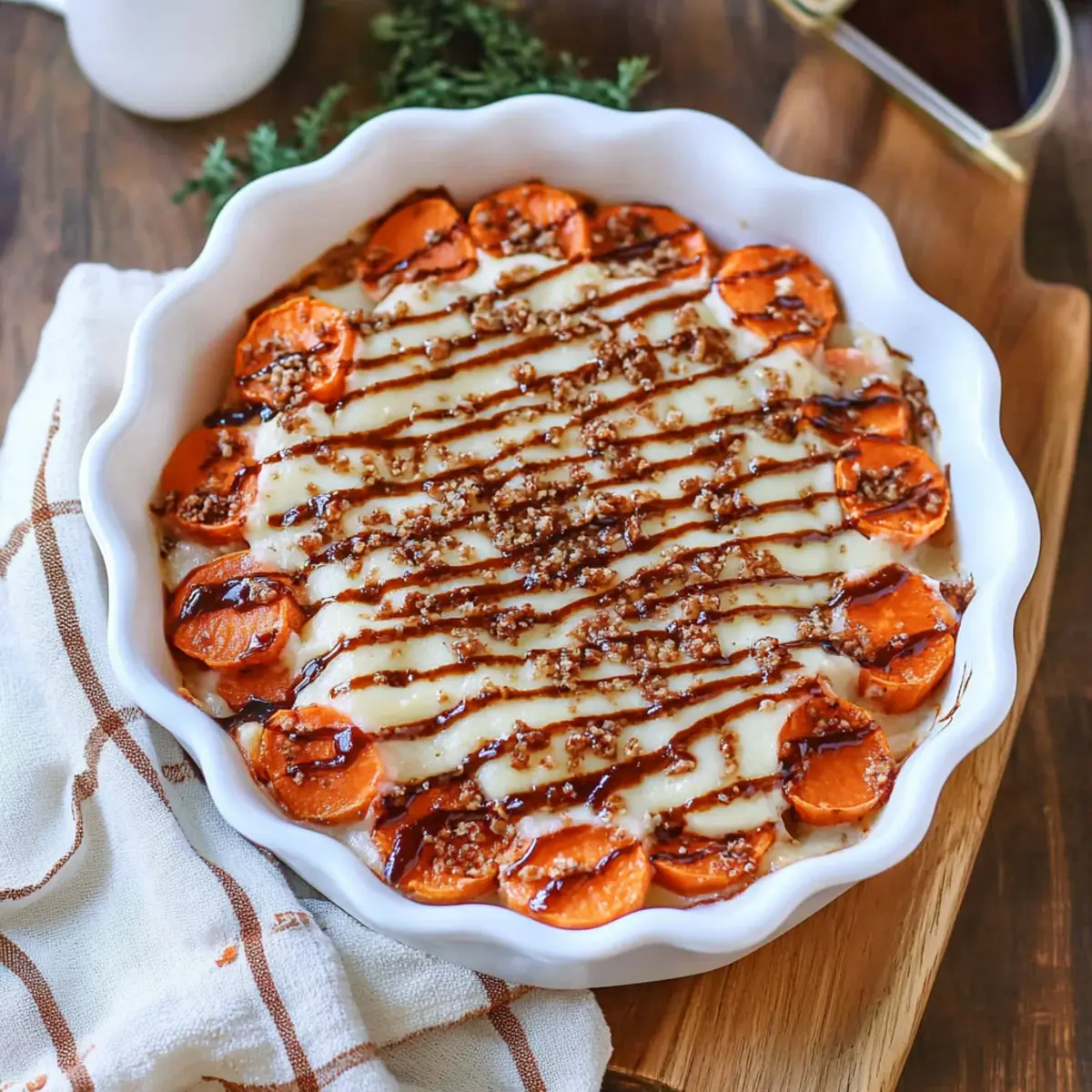 Schichtung für mehr Genuss: Wenn du einen besonderen Touch hinzufügen möchtest, versuche, die Süßkartoffeln in verschiedenen Schichten mit der Soße und den Zutaten zu schichten.