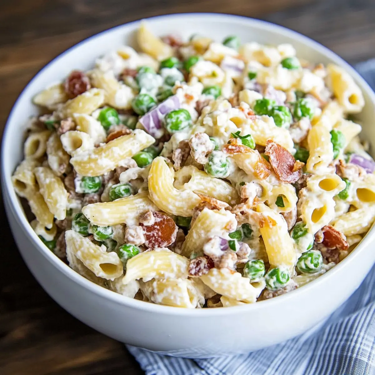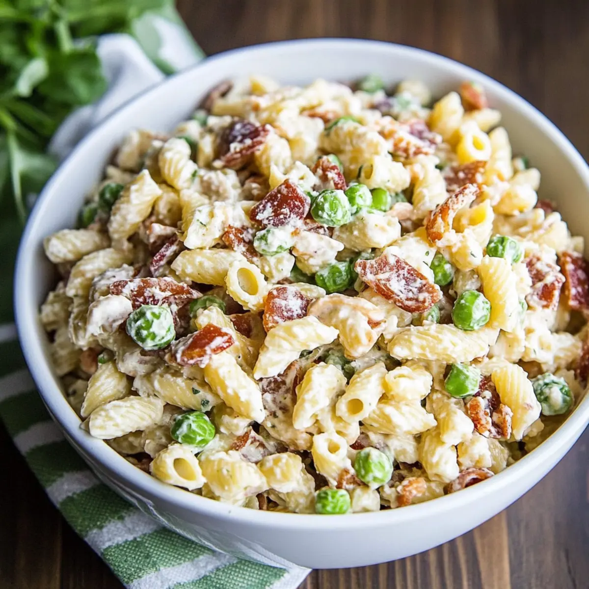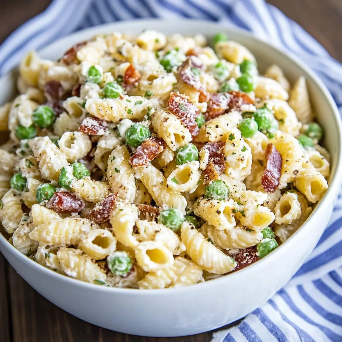 Dieser leckere Salat ist nicht nur ein echter Hingucker auf dem Tisch, sondern auch unglaublich vielseitig. Egal, ob für ein entspanntes Familienessen, eine Sommerparty oder ein Picknick – er lässt sich im Handumdrehen zubereiten. Mit einer Basis aus kleinen Nudeln, angenehm süßen Erbsen und knusprigem Speck, bietet er eine perfekt abgestimmte Kombination aus Aromen und Texturen.
