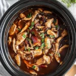 - Das zerkleinerte Hähnchen zurück in den Slow Cooker geben und alles gut vermengen. Weitere 5–10 Minuten kochen lassen, bis die Sauce dick wird.