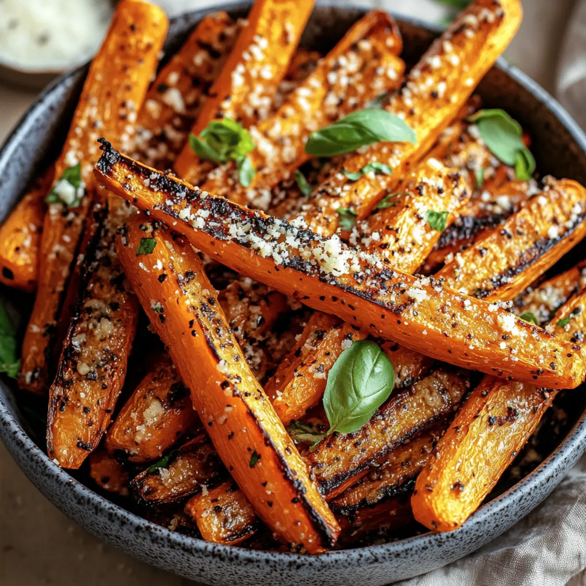 - Parmesan hinzufügen: Streue den Parmesan kurz vor Ende der Röstzeit über die Karotten und röste sie weitere 5 Minuten.