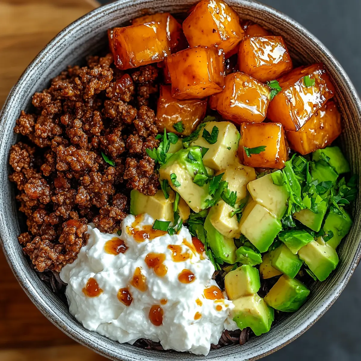 Die Schüssel schichten: Beginnen Sie mit einer Schicht der gerösteten Süßkartoffeln. Fügen Sie das gewürzte Hackfleisch hinzu, dann eine großzügige Portion Quark sowie einige Scheiben Avocado. Runden Sie das Ganze mit einem Spritzer scharfen Honig ab.