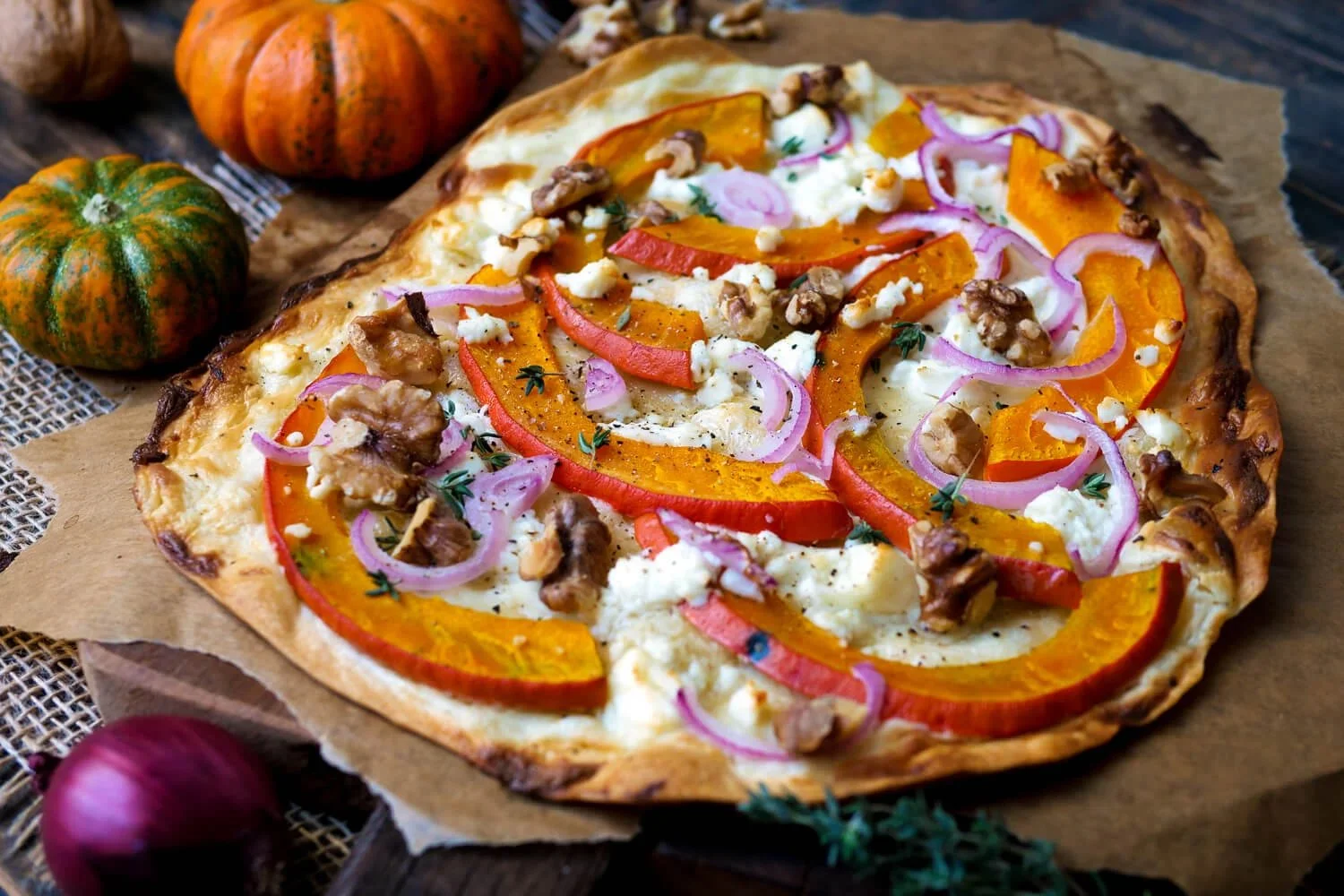 Wie man Kürbis-Flammkuchen mit Feta macht
