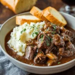 7. Zum Servieren, löffeln Sie das zarte Rindfleisch und die Soße über die Kartoffelbrei und servieren Sie es neben dem warmen Knoblauchbrot.