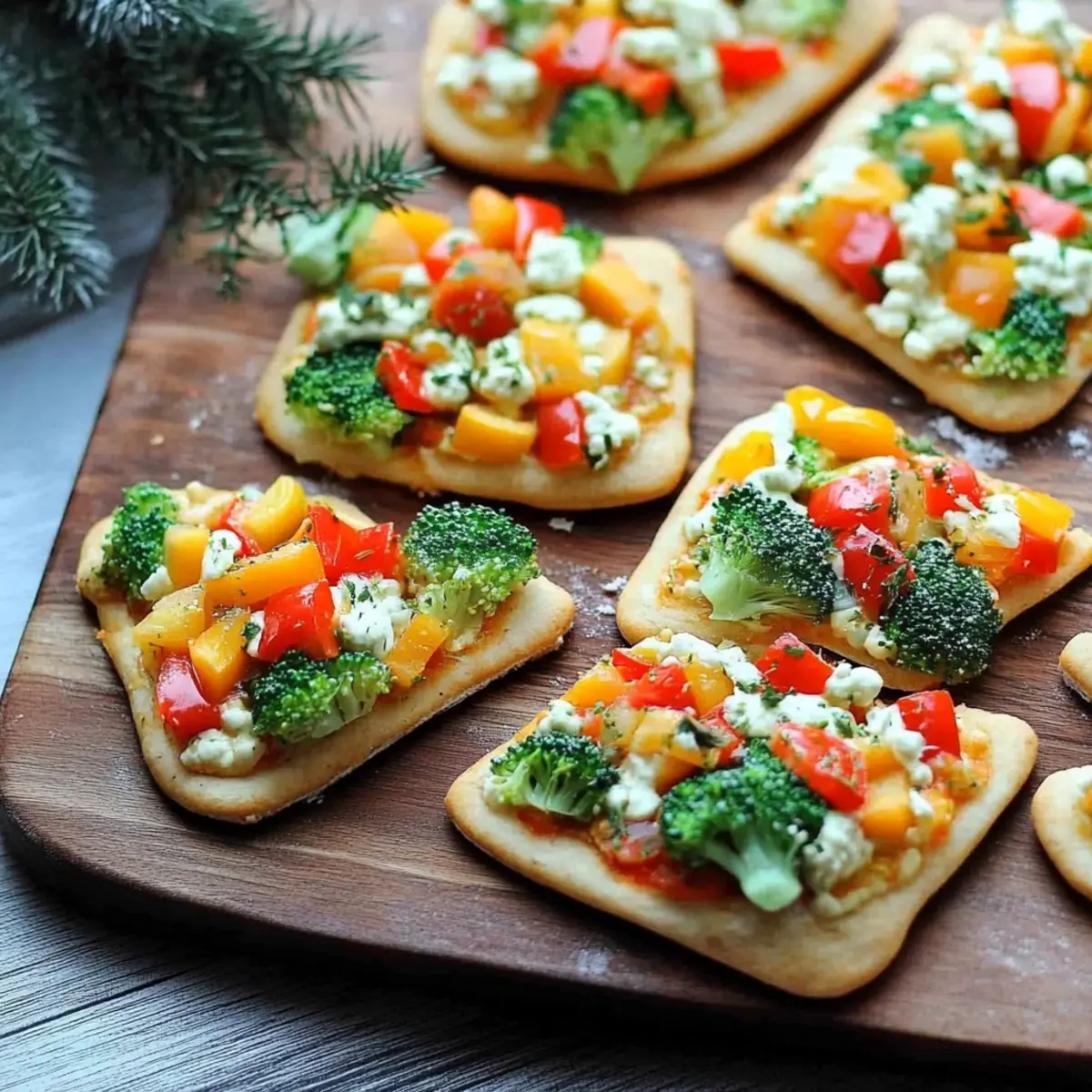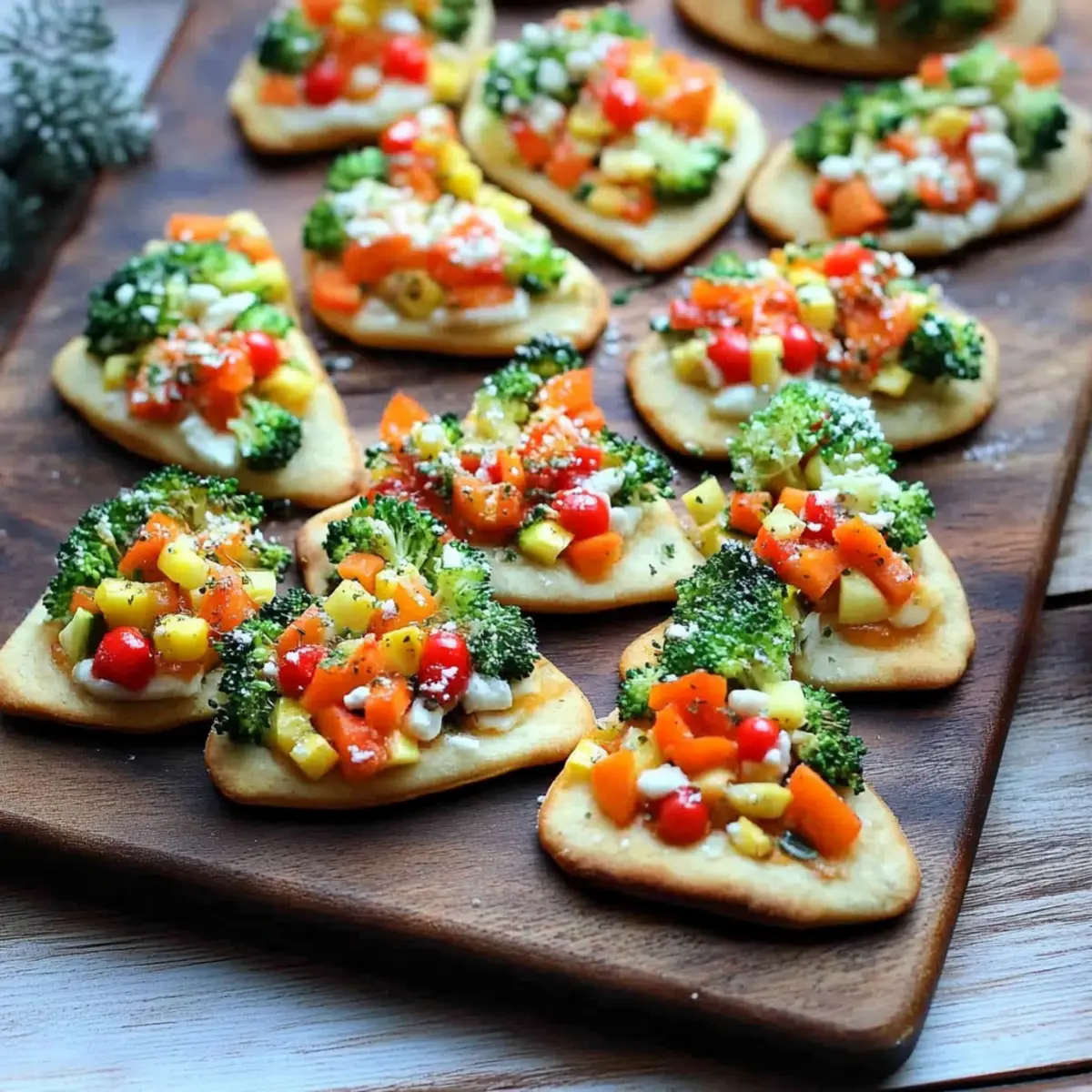 Erleben Sie den bunten Crunch einer kalten Gemüsepizza, die in der zauberhaften Form eines Weihnachtsbaumes präsentiert wird! Diese einfach zuzubereitende Vorspeise kombiniert die Cremigkeit von Hummus mit einem farbenfrohen Konfetti aus frischem Gemüse. Perfekt für festliche Zusammenkünfte, sind diese Mini-Pizzen gesund, anpassbar und visuell ein Festmahl.